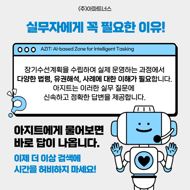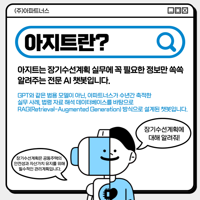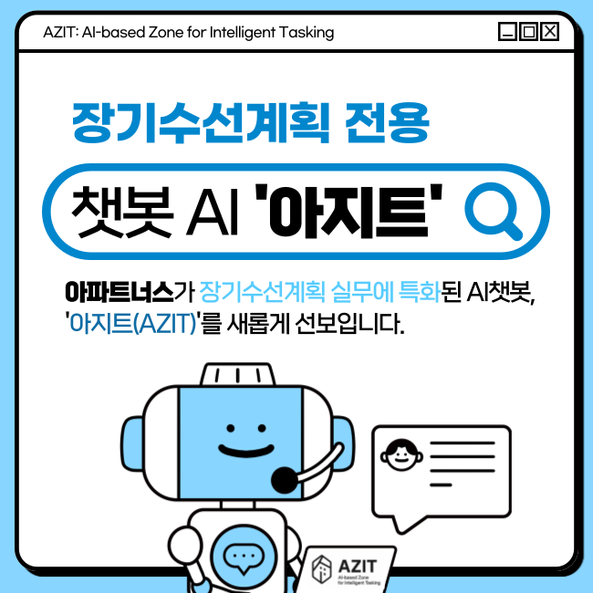아파트너스가 장기수선계획 전용 AI챗봇 아지트(AZIT)로 실현했습니다.