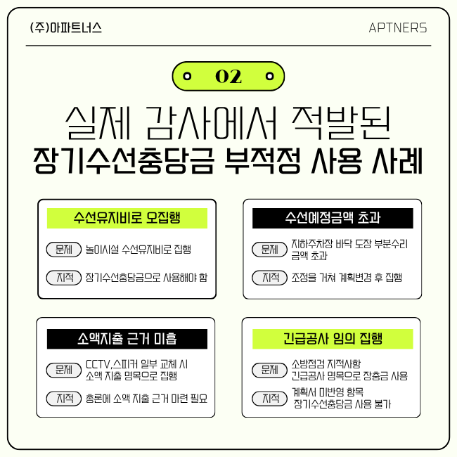 - 지적 사유 : 긴급공사라도 계획서에 반영된 항목만 장기수선충당금 가용 가능. 임의 집행은 부적정
