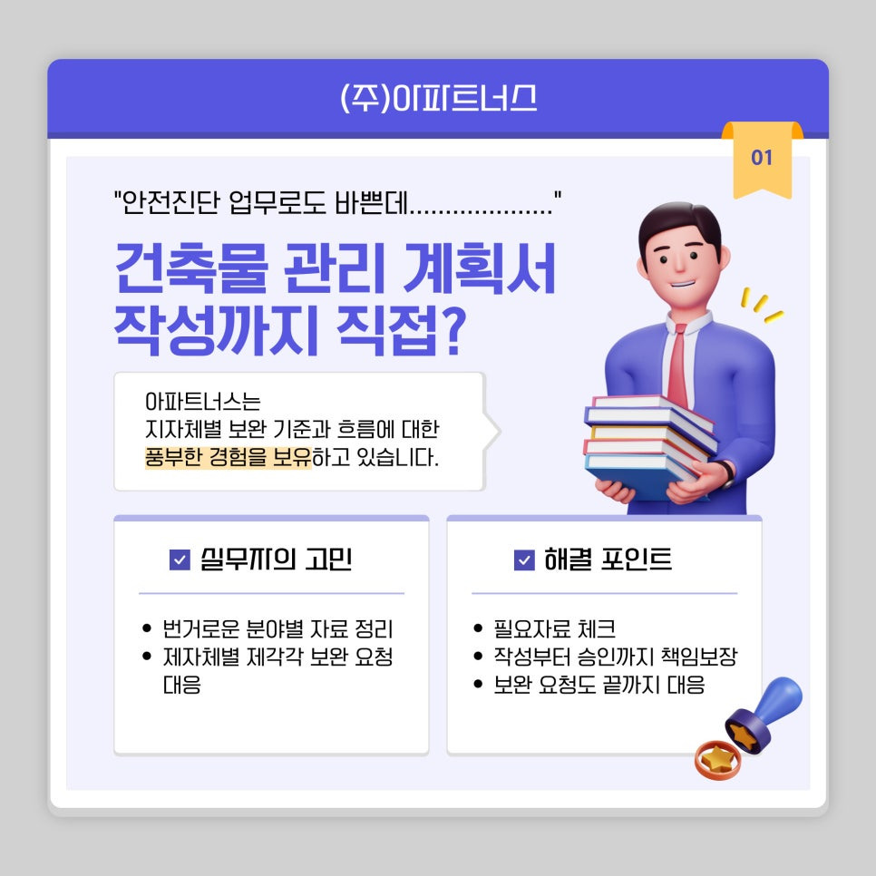 점점 더 많은 업체가 건축물관리계획은 아파트너스에 맡긴다는 선택을 하고 있습니다.