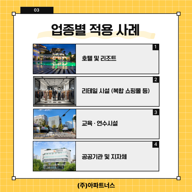 공동주택을 넘어 다양한 업종의 스마트 전환을 지원합니다.