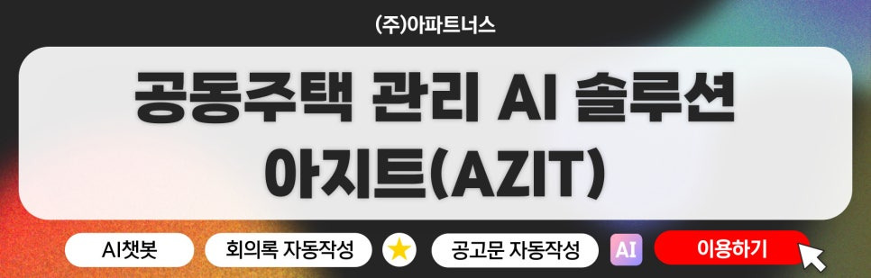 | 아파트너스, 장기수선계획 전용 AI 챗봇 '아지트(AZIT)' 출시! (1) | 2025.05.13 |