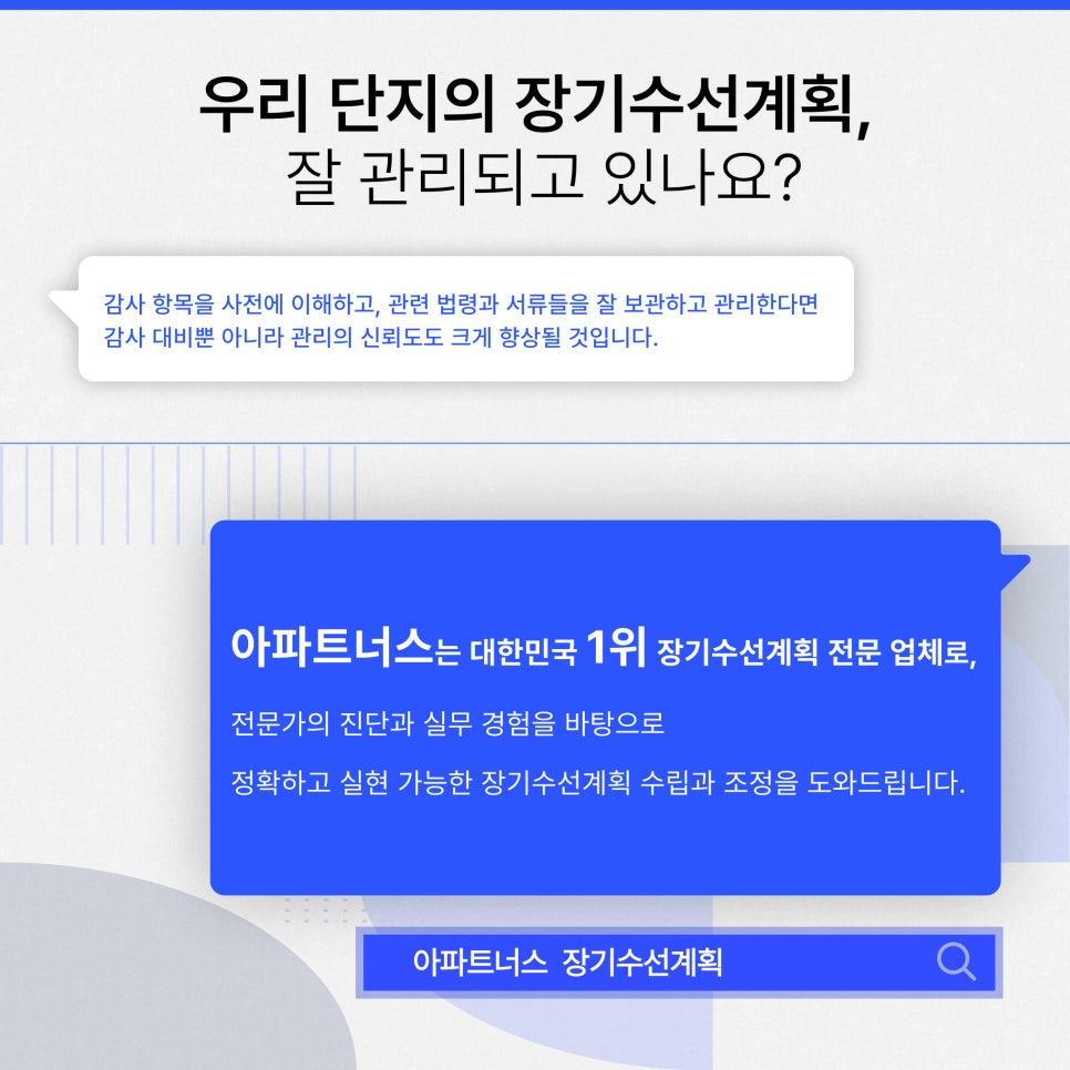 정확하고 실현 가능한 장기수선계획 수립과 조정을 도와드립니다.