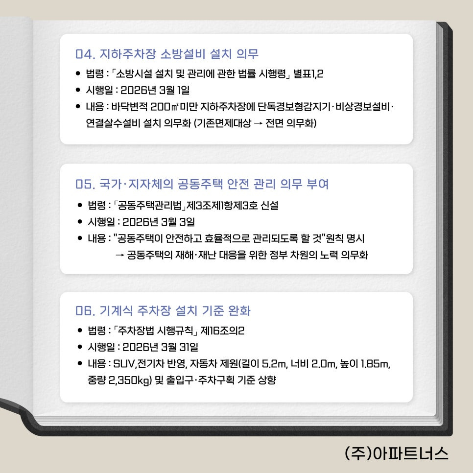 | 2026년 공동주택관리법 개정 내용 핵심 정리 : 과태료·안전 관리 변화 (0) | 2025.12.31 |