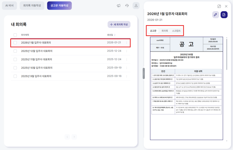 ④ 회의록, 공고문, 녹음파일 스크립트까지 자동 작성 확인