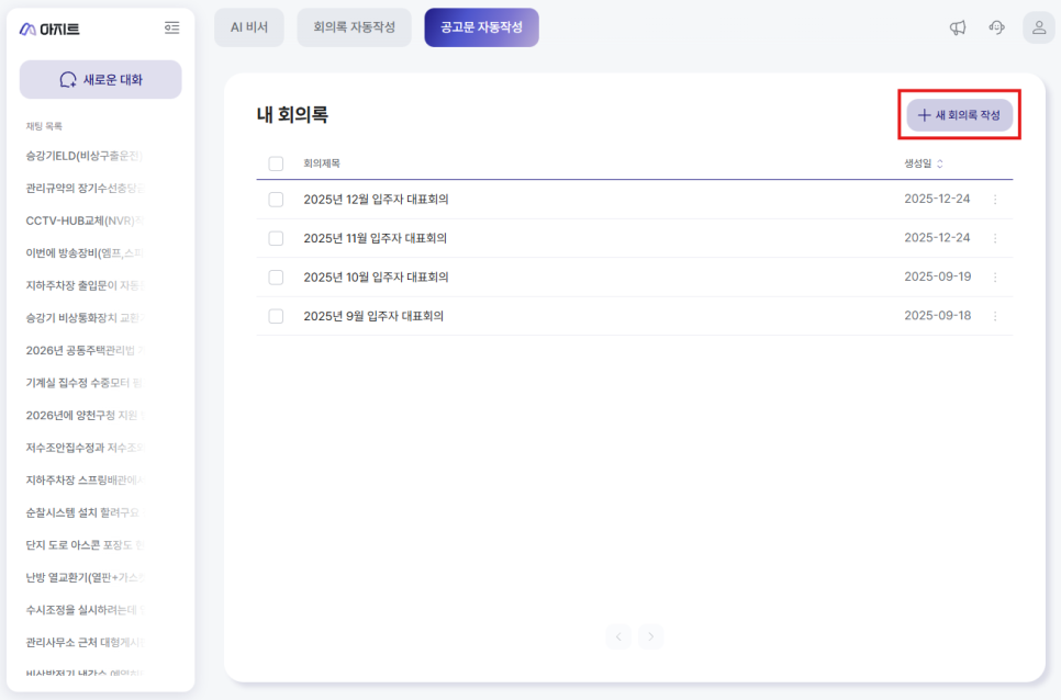 ① 아지트 로그인 후 [회의록 자동작성] 버튼 클릭