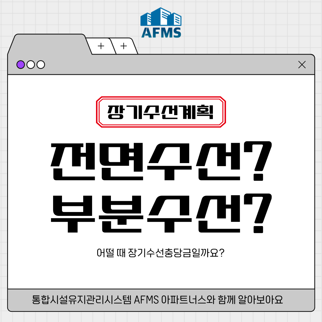 국토교통부에서 발간된 2022 장기수선계획 실무가이드라인을 바탕으로 관리 실무를 진행하다 보면 이해가 되지 않고 어려운 부분이 있으셨을 것입니다. 특히나 장기수선공사를 시행하실 때 이것이 전면수선인지 부분수선인지, 부분수선이라면 장기수선충당금인지 수선유지비인지 헷갈리시는 분들이 많습니다.